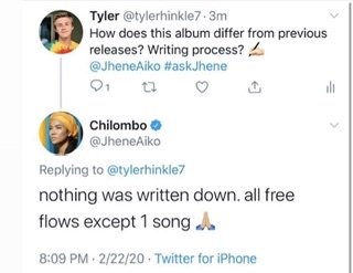 Jhene Aiko has a soothing, ethereal voice that she incorporates very well into the tone of her music. I believe there is a sense of healing power to her voice and production, especially on this record where she stated that she incorporated sound bowls into every single track that align with different chakras. I reached out to Jhene via Twitter during her Q&A and asked her about the writing process behind this record and how it differed from her past projects. To which she responded,